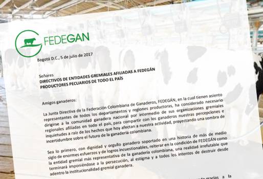 La Junta Directiva de Fedegán ha considerado necesario dirigirse a la comunidad ganadera nacional para compartir sus percepciones e inquietudes a raíz de los hechos que hoy afectan a la actividad, proyectando una sombra de incertidumbre sobre el futuro de la ganadería colombiana. El contenido de la carta es el siguiente: Sea lo primero, con dignidad y orgullo ganadero soportado en una historia de más de medio siglo de enormes esfuerzos y de logros incuestionables, reiterar en la condición de Fedegán como la entidad gremial más representativa de la ganadería colombiana, una realidad irrefutable que terminará imponiéndose a la persecución, al estigma y a todos los intentos de destruir desde adentro la institucionalidad gremial ganadera. (Lea: Emergencia sanitaria en todo el país por fiebre aftosa) La Fiebre Aftosa Después de hacer realidad el Fondo Nacional del Ganado, logro alcanzado gracias a la representatividad de Fedegán y a la persistencia de Hernán Vallejo Mejía, José Raimundo Sojo Zambrano y Jorge Visbal Martelo, acompañados siempre por el expresidente emérito de la Federación, Miguel Santamaría Dávila y por un claro liderazgo ganadero regional; un Fondo que, dicho sea de paso, está tan vigente como la Ley 89 de 1993 que lo creó, aunque hoy se pretenda reemplazarlo por una cuenta de nombre espurio y sin ningún sustento legal; después de esa inmensa conquista –reiteramos–, le sigue en importancia el de haber logrado convocar, cuatro años después, el interés del Gobierno y del Legislativo alrededor de la erradicación de la Fiebre Aftosa como “un propósito nacional”, a partir de la expedición de la Ley 395 de 1997. Nació entonces el Programa Nacional de Erradicación de la Fiebre Aftosa, alimentado con recursos de la Cuota de Fomento Ganadero y Lechereo, y operado por Fedegán como entidad administradora del Fondo Nacional del Ganado, en alianza estratégica con el ICA como autoridad sanitaria nacional y con el Ministerio de Agricultura. Después de décadas de esfuerzos desarticulados, desfinanciados y, por lo tanto, infructuosos –la aftosa había llegado al país desde 1950–, el nuevo modelo empezó a rendir sus frutos y, cuatro años después, en 2001, se obtuvo la primera certificación regional de libre de aftosa con vacunación. (Lea: Brote de aftosa prueba incapacidad de Unaga y NFG para manejar ciclo) Desde entonces los resultados se fueron multiplicando hasta 2009, cuando se recibió la última certificación regional que completó el mapa del país libre de aftosa con vacunación. No solo demostramos que SÍ se podía, sino que cumplimos con la promesa de valor de la primera campaña del FNG –Colombia sin Aftosa, un propósito nacional–, y más importante aún, logramos que el país cumpliera sus compromisos con el Plan Hemisférico de erradicación definido por la Comisión Hemisférica para la Fiebre Aftosa –COHEFA–, mientras que el modelo colombiano de erradicación recibía reconocimiento internacional. Hoy, ganaderos de Colombia, esa conquista está en riesgo, como lo están todas las alcanzadas por Fedegán, desde cuando, hace más de medio siglo, nació como una unión de voluntades ganaderas frente a la amenaza a la legítima propiedad de la tierra por cuenta de la reforma agraria expropiatoria, amenaza que hoy también reaparece como parte de los compromisos del Acuerdo Final con las Farc. En el mes de julio de 2016, el presidente de Fedegán, con el respaldo de la Junta Directiva de la Federación, advirtió oficialmente a la COHEFA sobre lo que, infortunadamente, hoy está sucediendo: la reaparición de la fiebre aftosa en el territorio nacional. (Lea: Reacciones de los exportadores ante el cierre de mercados por Aftosa) En su intervención, el doctor José Félix Lafaurie informó a las autoridades sanitarias del hemisferio sobre los riesgos de desmontar el equipo técnico-científico que no solo había concebido el Programa Nacional de Erradicación de la Fiebre Aftosa plasmado en la Ley 395 de 1997, sino que también lo había ejecutado con resultados incuestionables durante 18 años consecutivos, hasta el mes de diciembre de 2015, cuando el Gobierno le arrebató a Fedegán la administración del Fondo Nacional del Ganado, desarticuló todos sus programas y despidió a sus empleados, entre ellos al equipo de Salud Animal, limitándose desde entonces a tratar de darle continuidad a los ciclos semestrales de vacunación, con los resultados conocidos. Rechazamos enfáticamente las declaraciones del ministro Iragorri frente a las legítimas denuncias de Fedegán por la ocurrencia del brote de Aftosa en Arauca, sobre todo cuando se refiere al equipo técnico-científico y operativo del FNG encargado de los programas sanitarios como una burocracia bien paga que no hacía nada en Bogotá. Desestimar las ventajas de la planeación, la dirección y el control acertado que lograron la certificación de país libre con vacunación desde 2009, y que permitieron que el Programa Nacional de Erradicación contara, inclusive, con certificación de calidad ISO debidamente auditada hasta el año 2015, es desconocer la realidad, máxime cuando apenas un año después de asumir directamente el control del Programa de Erradicación los ganaderos nos enfrentamos a la reaparición de la fiebre aftosa. (Lea: Efectos del brote de Aftosa en Arauca) ¿Qué se perdió? Aunque el Ministro de Agricultura ha tratado de desestimar ante los medios la gravedad de lo sucedido, el ICA sí parece entenderla, a juzgar por su declaratoria de “emergencia nacional sanitaria” durante un año y en todo el territorio nacional. De nuestra parte, la Junta Directiva respalda íntegramente los planteamientos públicos del presidente de Fedegán sobre la afectación para la ganadería nacional: 1. Se perdieron ocho (8) años de continuidad sin la ocurrencia de brotes de aftosa en el territorio nacional. 2. Se perdieron, hasta ahora, los mercados de paí