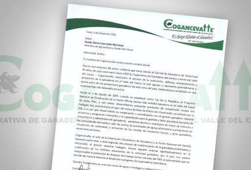 A través de un oficio enviado al Ministerio de Agricultura, Cogancevalle resaltó toda la cooperación que le ha ofrecido Fedegán a esa asociación, gracias a la buena administración de los recursos del Fondo Nacional del Ganado por parte de la entidad.