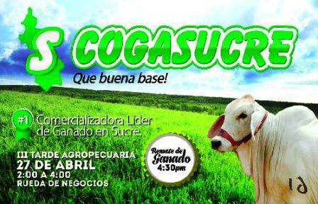 Con el objetivo claro que llevar a los ganaderos lo último en tecnología agropecuaria, la Comercializadora de Ganado de Sucre, Cogasucre, llevará a cabo el próximo sábado, 27 de abril, la III Tarde Agropecuaria, en el auditorio de Cogasucre, en Sincelejo.