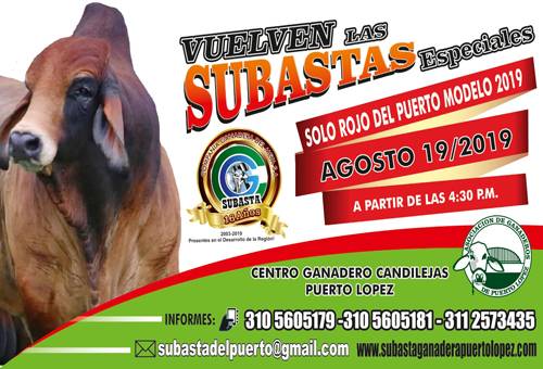 La subasta especial Solo Rojo del Puerto modelo 2019 tendrá lugar el lunes festivo 19 de agosto a partir de las 4.30 pm en el Centro Ganadero Candilejas de Puerto López. (Lea: Resultados de la evaluación de canales de ganado del Meta en Expomalocas 2018)