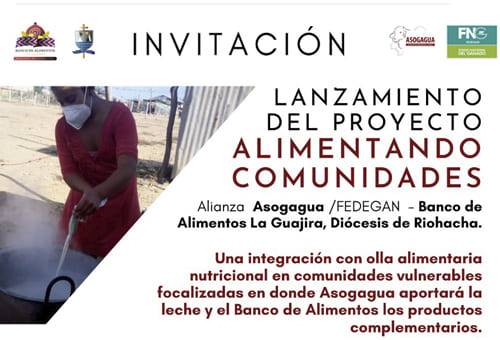 El día 1 de abril se hará el lanzamiento de este proyecto en el cual participa el Fondo Nacional del Ganado (FNG), la Asociación de Ganaderos de La Guajira (Asogagua), el Banco de Alimentos y la Diócesis de Riohacha en la Parroquia Nuestra Señora de Fátima ubicado en el Asentamiento indígena El Cangrejo a las 9:00 a.m.