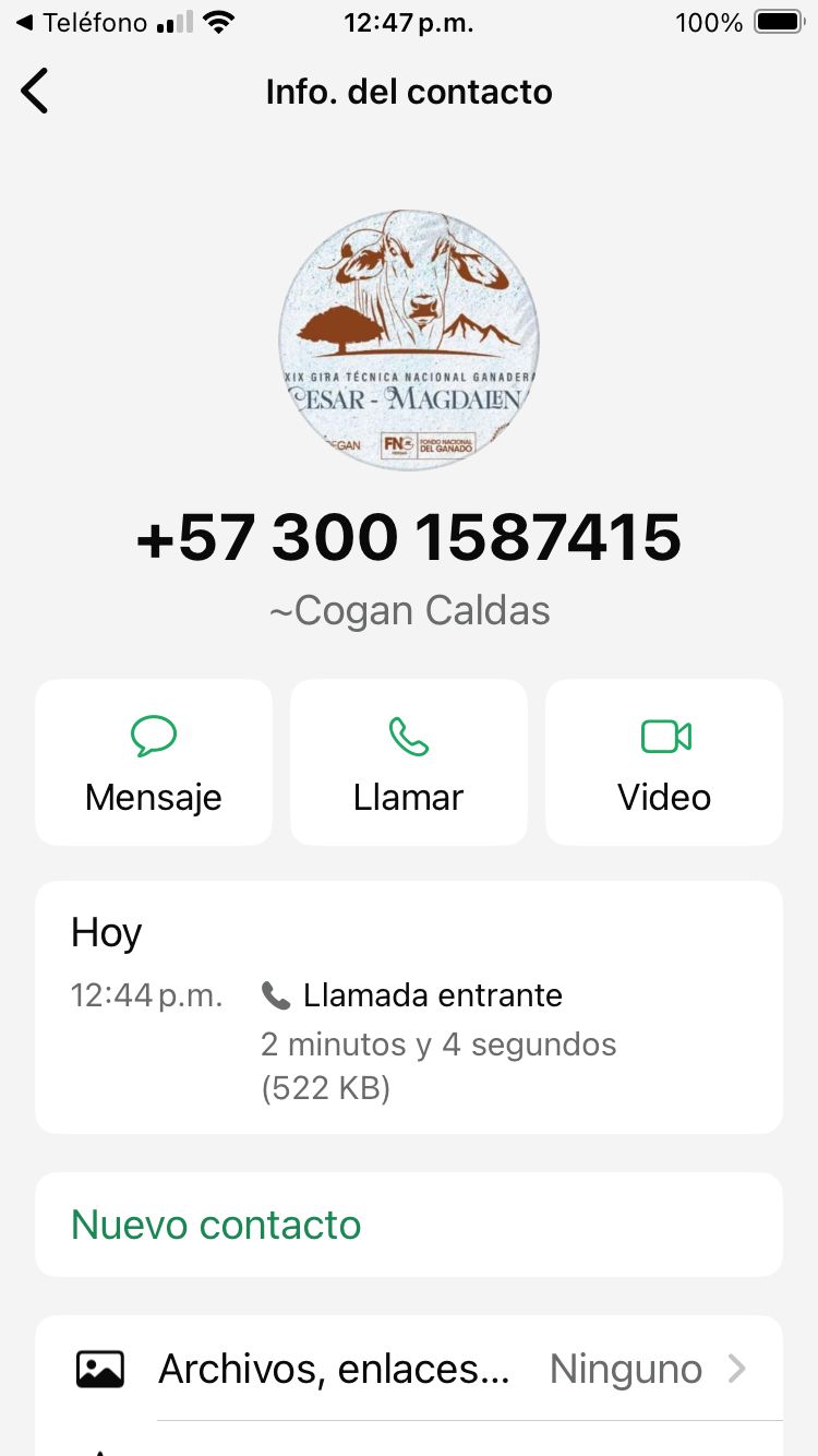 Este es el número desde el cual intentan estafar a nombre de Cogan Caldas y usando el logo de la pasada Gira Técnica Nacional de Fedegán. Foto: Cortesía