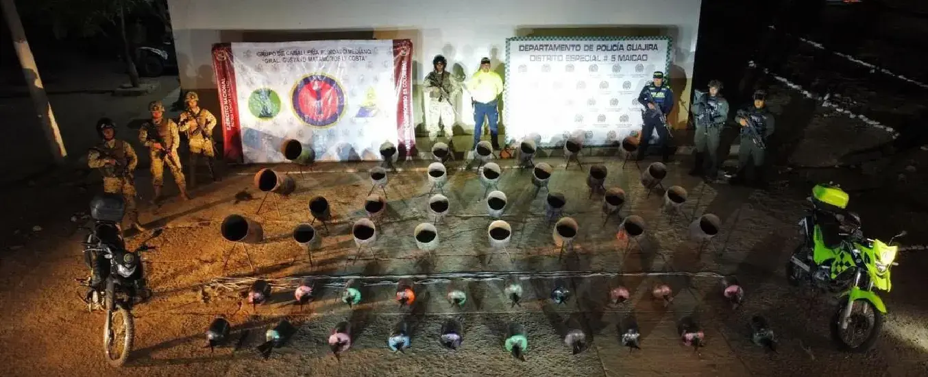 A través de su cuenta oficial en X, el ministro de Defensa, Pedro Sánchez, informó sobre los positivos resultados operacionales que permitieron la incautación de 26 cilindros de 30 libras adaptados como medios de lanzamiento, tres cilindros de 100 libras, 20 artefactos explosivos y 200 metros de cable dúplex en zona rural de Maicao, La Guajira.