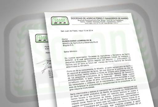 La Sociedad de Agricultores y Ganaderos de Nariño, Sagán, entidad regional que agrupa a los productores del departamento, a través de una carta enviada al ministro de Agricultura, Rubén Darío Lizarralde, respalda el trabajo realizado por Fedegán y asegura que gracias a las numerosas acciones adelantadas por el gremio se han podido mitigar las necesidades y colaborar con el mejoramiento del sector en aras de fortalecer la productividad y competitividad de cerca de 40 mil familias que dependen de la ganadería.
