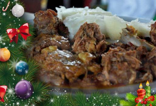 Ese arroz se deja en reposo. Mientras se prepara una mezcla de cebollín (cebolla larga), apio, ají topito, zanahoria y papa cortada en rodajas, los cuales se alistan en una bandeja. La proteína que lleva este plato es cerdo o gallina. Las porciones se adoban y cocinan en su adobo, las cuales, una vez estén blandas, se retiran del fogón y se ponen en un plato que facilite el proceso de armado del pastel. (Lea: La cena de diciembre se puede comprar en la UN)