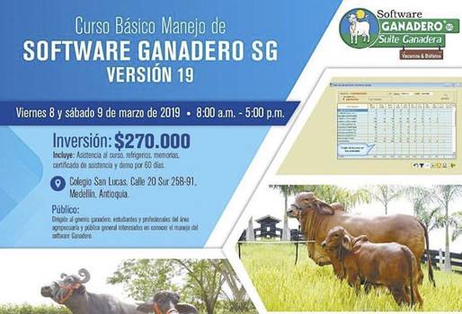 El curso se realizará en el auditorio colegio San Lucas en Medellín, en la calle 20 sur # 25B – 91, los días 8 y 9 de marzo. El costo es $270 mil, que incluye refrigerio, certificado, memorias y demo por 60 días. (Lea: Fundación Capitán Yunyi ofrece nuevo curso de Software Ganadero)