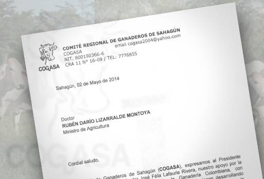 “El Comité de Ganaderos de Sahagún (Cogasa) expresamos al presidente ejecutivo, doctor José Félix Lafaurie Rivera nuestro apoyo por la labor que viene haciendo en pro de la ganadería colombiana”, dice la carta firmada por Alfredo Miguel Dumar Abisambra, actual director ejecutivo de la entidad.