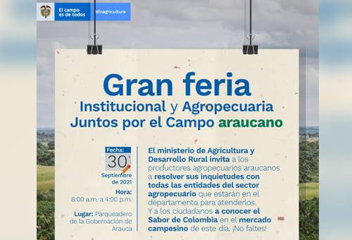 En la ‘Gran Feria Institucional y Agropecuaria’ participarán la Gobernación de Arauca y la Alcaldía, la Agencia Nacional de Tierras, Agencia de Desarrollo Rural, ICA, Banco Agrario, Agrosavia, Aunap entre otras entidades del sector agropecuario.