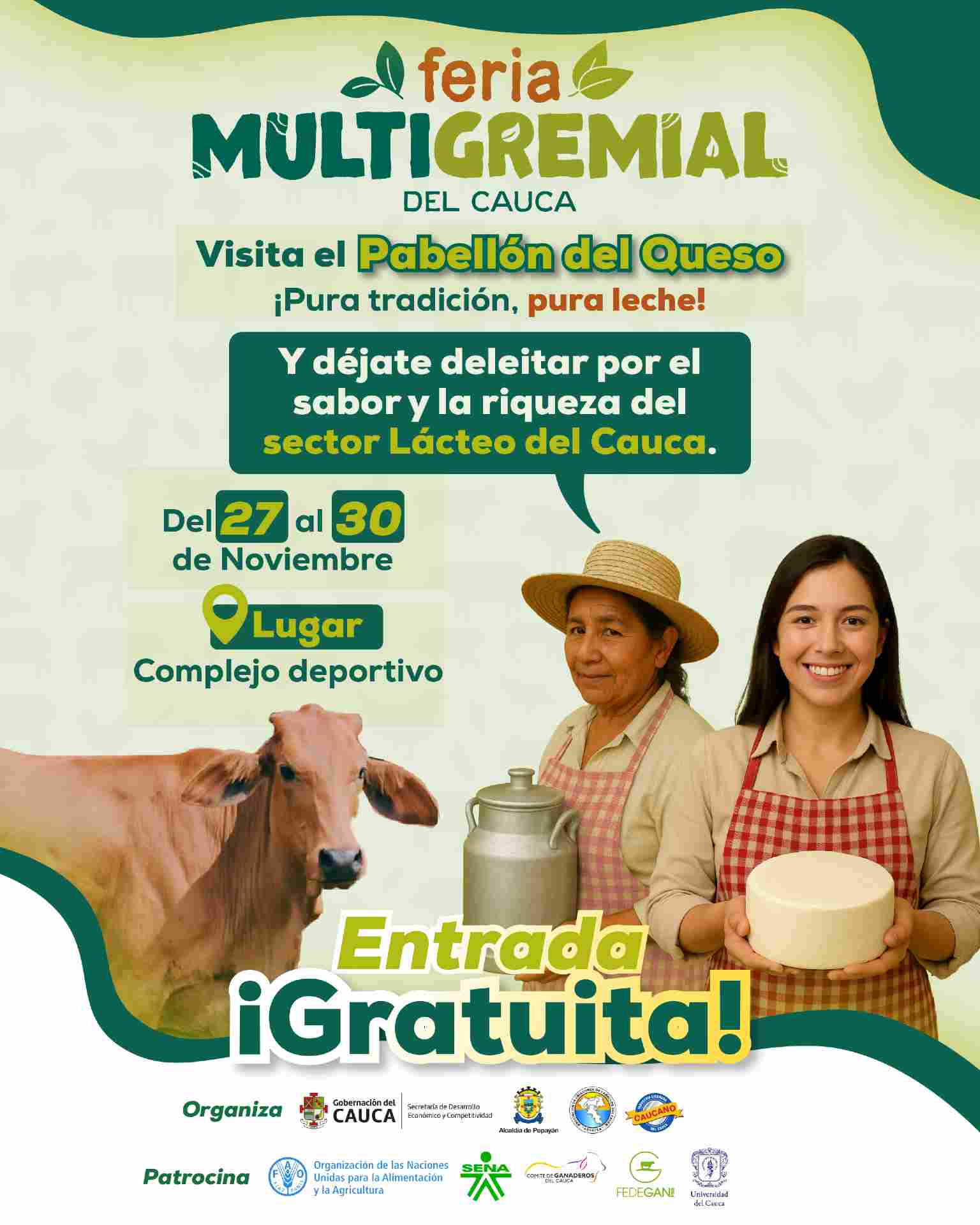 “En el marco de la feria, vamos a tener un pabellón del queso del Cauca liderado por la Secretaría de Desarrollo Económico y de Competitividad del Cauca. Allí vamos a tener un encuentro con todos ustedes para hablar del sector lechero en Colombia, y particularmente del caucano. Vamos a compartir experiencias, a buscarle solución a los problemas. Va a ser un espacio de crecimiento del sector en el departamento”, manifestó Arenas.