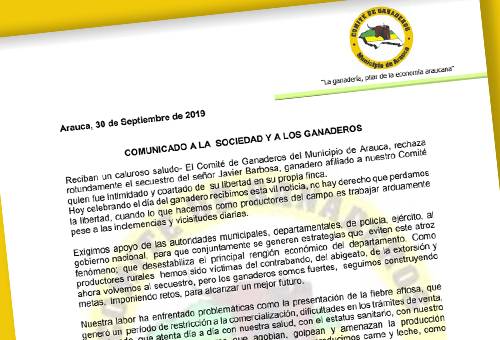 Los afiliados al Comité de Ganaderos del Municipio de Arauca alzan su voz para rechazar enfáticamente el secuestro del ganadero Javier Barbosa, quien en días pasado fue raptado desde su finca de mano de delincuentes.