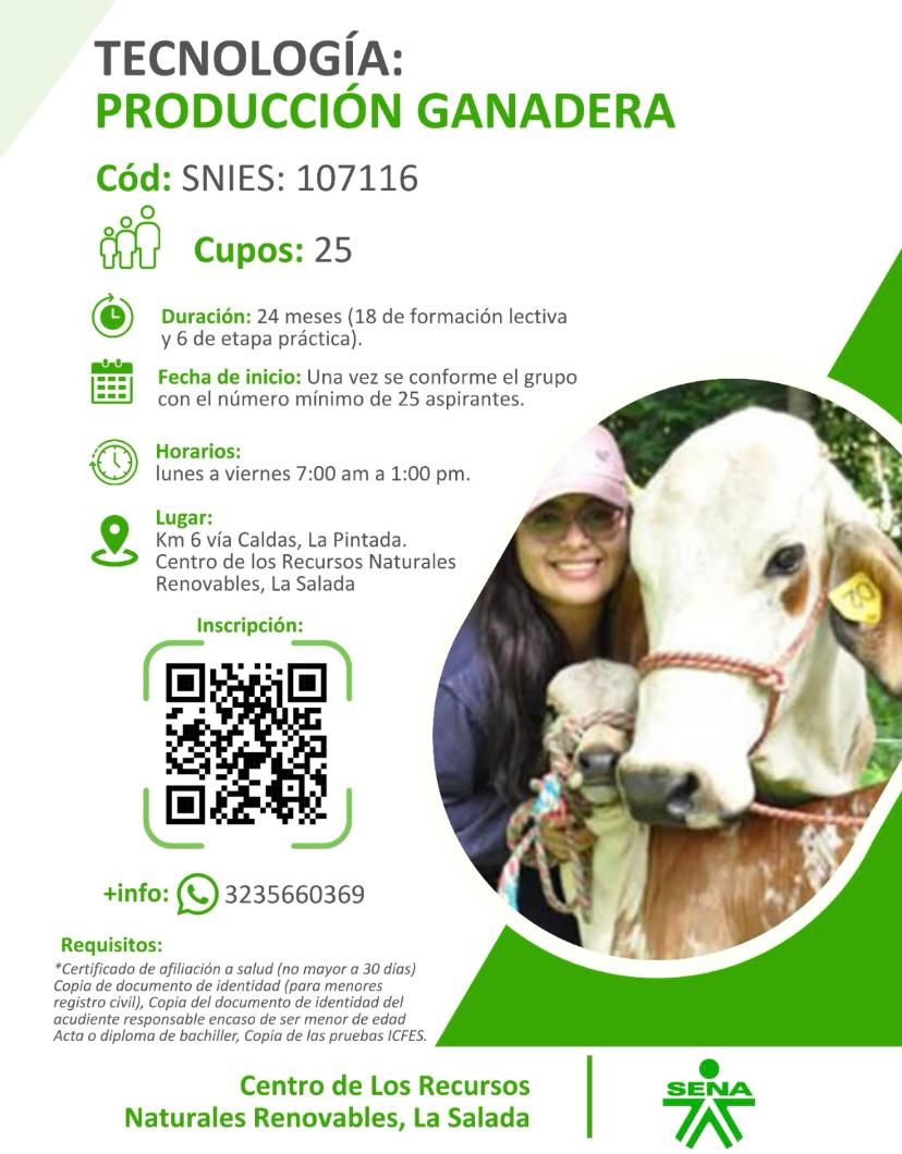 El Servicio Nacional de Aprendizaje (SENA) continúa apostándole al fortalecimiento del sector pecuario en Antioquia. Desde el Centro de los Recursos Naturales Renovables La Salada, ubicado en La Pintada, se anunció la apertura de nuevos programas técnicos y tecnológicos que buscan capacitar a los ganaderos y jóvenes rurales en producción y gestión animal.