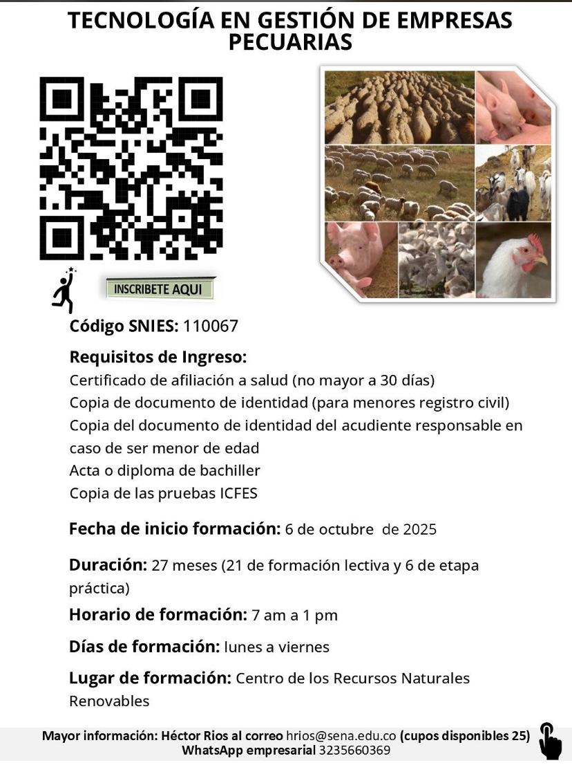 También está abierta la convocatoria para la Tecnología en Gestión de Empresas Pecuarias, dirigida a quienes deseen adquirir conocimientos administrativos y productivos aplicados al manejo de especies como bovinos, porcinos, ovinos y aves. (Lea en CONtexto ganadero: Fedegán-FNG y SENA lanzan 16 cursos gratuitos de BPG en Cundinamarca)
