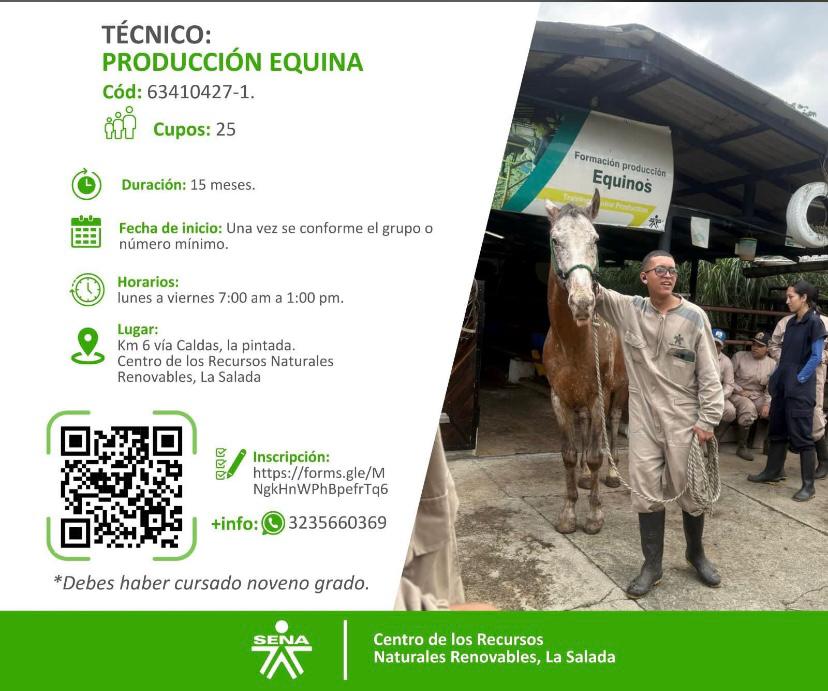 Finalmente, el SENA anunció la apertura del programa Técnico en Producción Equina, con una duración de 15 meses y horario de lunes a viernes de 7:00 a.m. a 1:00 p.m. Este programa está orientado a quienes deseen formarse en el manejo, reproducción y cuidado de caballos.