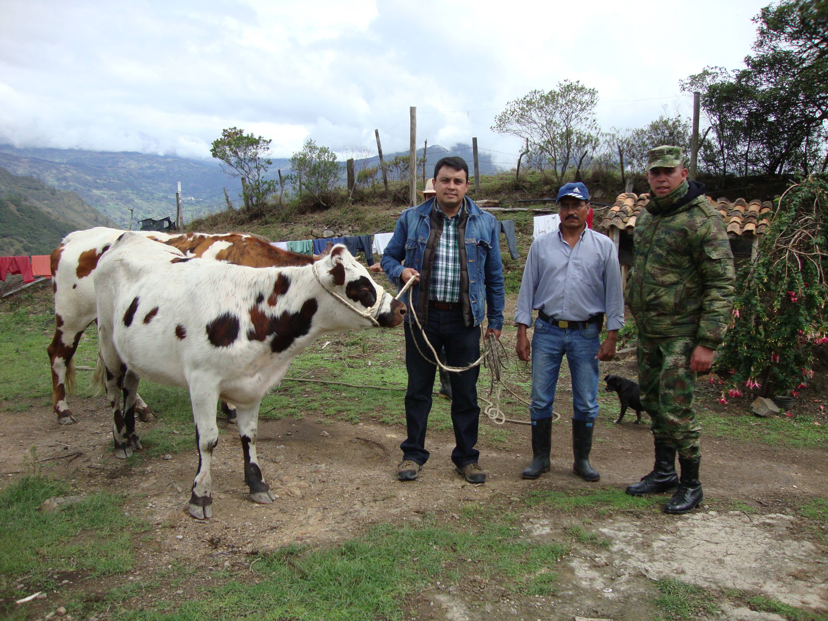 Hasta el predio ‘Las tres cruces’, ubicado en la vereda El Tobal del municipio de Espino, en el que vive John Fredy, llegó el médico Ramiro Vargas, de la Federación Colombiana de Ganaderos, Fedegán; representando a la Fundación Colombia Ganadera, Fundagán, quien en compañía del comandante del batallón de alta montaña, José Rangel Farfán, hicieron entrega de la vaca a este soldado que el pasado 3 de enero de 2012 perdió su pierna izquierda, consecuencia de una mina antipersonal, en Miraflores, Guaviare.