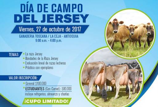 Con el propósito de instruir a más ganaderos y estudiantes, la organización promueve una jornada en la ganadería Toscana, que alberga ejemplares de la mejor genética de la raza Jersey, para este viernes 27 de octubre. La fundación Capitán Yunyi, que apoya la educación superior de los jóvenes del campo, está ofreciendo un día de campo teórico-práctico dedicado a la raza Jersey en la ganadería Toscana. Según la entidad, el objetivo de este día es aprender todo lo relacionado con estos ejemplares, destacados por su producción de leche, aprovechando la experiencia y la tradición de esta empresa. (Crónica: Ganadería Toscana: La vocación de promover la raza Jersey) En la jornada, se hará un recuento de las cualidades del Jersey, que se destaca no solamente por y la alta producción de leche y la calidad de la misma, sino también por su longevidad, rusticidad y mansedumbre. Además, la ganadería Toscana dispone de los bovinos con la mejor genética, con material y ejemplares traídos desde Canadá. Sus vacas han obtenido reconocimientos en concursos lecheros y demás competencias a nivel nacional, e incluso reciben pedidos de países como Ecuador, Perú y Venezuela. La jornada será dirigida por el experto Diego Sierra, quien es considerado una de las personas con mayor conocimiento en razas lecheras y, en especial, la Jersey. (Lea: La fundación Capitán Yunyi brinda ayuda a los jóvenes del campo) El evento cuenta con el apoyo de la Federación Colombiana de Ganaderos, Fedegán; la Asociación Colombiana de Criadores de Ganado Jersey, Asojersey; la Asociación Colombiana de Criadores de Ganado Cebú, Asocebú, las empresas Ivanagro, Río Grande, Klaren’s y la publicación Infortambo. La ganadería La Toscana está ubicada en el municipio de Rionegro, Antioquia, en el km 7.5 de la Recta Llanogrande. La jornada se realizará este viernes 27 de octubre de 9 am a 4 pm. La inscripción tiene un costo de $100 mil para todos y de $80 mil para estudiantes que porten su carnet. Incluye la visita, refrigerios y almuerzo. (Lea: En Medellín habrá una semana académica dedicada a la ganadería) Para más información, comuníquese a los teléfonos (4) 3217373 o 305 3765747. También puede escribir al correo [email protected] o visite los perfiles en Facebook, Twitter o Instagram.
