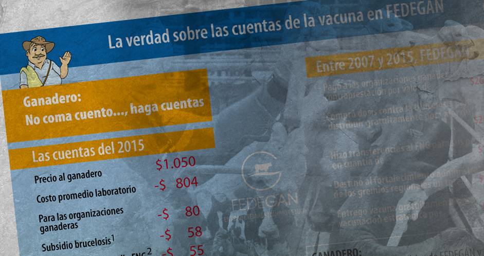 “A las organizaciones ganaderas regionales ejecutoras del Programa Nacional de Erradicación de la Fiebre Aftosa, con las que hemos trabajado durante años en el propósito conjunto de la erradicación de la fiebre aftosa y del control y erradicación de la brucelosis bovina y, en general, a toda la comunidad ganadera del país, les manifestamos nuestro rechazo por la burda estrategia del Ministerio de Agricultura en la cual anuncia una rebaja del precio de las dosis de vacuna a los ganaderos y una mayor contraprestación a las organizaciones ejecutoras a partir del ciclo de vacunación que inicia el próximo mes de mayo; y a través de unas cuentas mal hechas acusa a Fedegán de apropiarse indebidamente de recursos de los ganaderos”, aseveró el dirigente. Tras la gráfica difundida por la Cartera Agropecuaria, el gremio también dio a conocer una infografía con la que responde a la constancia #5, que fue dejada el 29 de enero en el marco de la Junta Directiva del Fondo Nacional del Ganado. “Es infame, por decir lo menos, que el Ministerio siga apelando a la desinformación y a las medias verdades para desprestigiar a Fedegán ante los gremios ganaderos ejecutores del programa de vacunación contra la fiebre aftosa y la brucelosis bovina, con los que trabajamos, hombro a hombro, durante casi dos décadas para lograr y conservar la certificación de país libre de aftosa”, remató. (Lea: Colombia tiene la 2da vacuna anti aftosa más económica de la región)