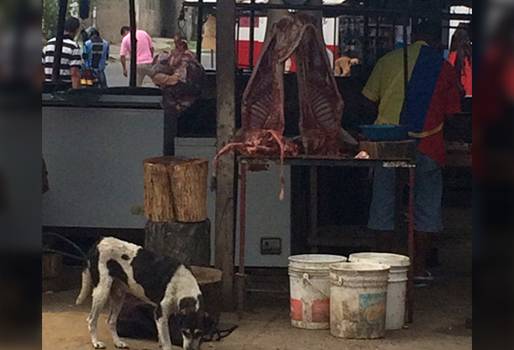 “Fui sobre las 8 de la mañana de paso y vi varias casetas abiertas. En ellas la carne colgaba de unos ganchos oxidados y viejos. El alimento era dividida sobre unas tablas sucias, mientras que la grasa que salía de cada sección del cerdo era repartida entre los gatos y perros que merodeaban el lugar”, contó el denunciante.