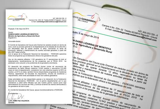 El Comité de ganaderos de Cauca le pide al ministro de Agricultura, Rubén Darío Lizarralde, que sea Fedegán quien siga al frente del manejo del fondo parafiscal, entidad a la que agradece sus buenos oficios a favor del sector.