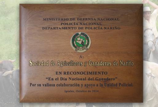 En el marco del día del ganadero, organizado por la Sociedad de Agricultores y Ganaderos de Nariño, Sagán, la Policía del departamento aprovechó y le entregó un reconocimiento, por su activa gestión en aras de preservar la seguridad y tranquilidad entre los productores agrícolas y pecuarios del sur del país. (Lea: Día del Ganadero se celebra este fin de semana en todo el país)