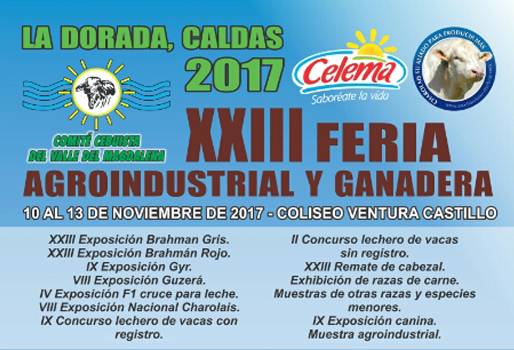 En noviembre llega la XXIII Feria Agroindustrial y Ganadera en este importante epicentro pecuario del Magdalena medio. Faltan 4 días para inscribir sus ejemplares para esta versión. El Comité Cebuista del Valle del Magdalena realiza la 23a feria, que incluye igual número de ediciones para la exposición de Brahman gris y rojo. (Lea: XXII Feria Agroindustrial y Ganadera de La Dorada) De igual modo, se llevará a cabo la 9a exposición de ganado Gyr, la 8a de Guzerá, la IV de F1 para leche, así como el IX concurso de vacas lecheras con registro y el II de vacas sin registro. Al mismo tiempo, tendrá lugar la VIII Exposición Nacional de la raza Charolais, que se realiza por primera vez en la región, y una exhibición de razas de carne. . En la feria no puede faltar el remate de cabezal, que también cumple 23 años. Incluye muestras de otras razas y especies menores, y la exposición canina. (Lea: Este fin de semana visite la feria ganadera de La Dorada) Este evento reúne generalmente de 600 a 700 ejemplares bovinos, aunque la idea es reunir más de 1.000 para acceder al título de feria nacional. Por este motivo, no pierda la oportunidad de participar con sus mejores animales y de comercializarlos en este encuentro. Tendrá lugar del viernes 10 al lunes 13 de noviembre en el coliseo Ventura Castillo, donde tradicionalmente se realiza. La entrada es gratuita. (Lea: El éxito de las pruebas de desempeño en pastoreo de Asocebú) Para más información, llame al (4) 8391658 y 3104692737, escriba al correo [email protected] o consulte el perfil en Facebook. El Comité Cebuista del Valle del Magdalena es la entidad sin ánimo de lucro que organiza la feria, con el patrocinio de Asociación Colombiana de Criadores de Ganado Cebú, la Alcaldía Municipal Vive La Dorada, la Cámara de Comercio del municipio y el Comité de Ganaderos.