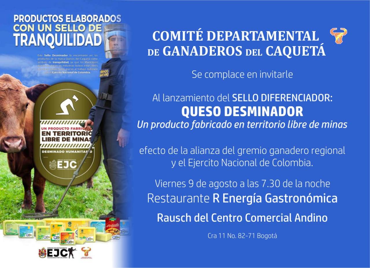 En tal virtud, este viernes presentará su nuevo producto denominado ‘Queso desminador’, un producto que proviene de territorios libres de minas antipersona, lo cual fue posible gracias al trabajo del Comité de Ganaderos del Caquetá y el Ejército Nacional. (Lea: Caquetá ve en el queso una actividad contra la violencia)