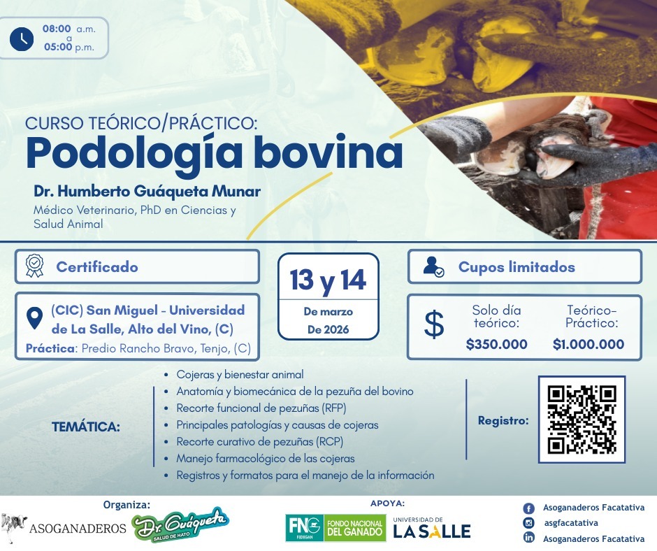 La podología bovina se ha convertido en un tema clave para la rentabilidad y el bienestar en los hatos ganaderos. Pensando en esta necesidad, los próximos viernes 13 y sábado 14 de marzo de 2026 se llevará a cabo el curso teórico/práctico sobre podología bovina, liderado por el médico veterinario y PhD Humberto Guáqueta Munar.