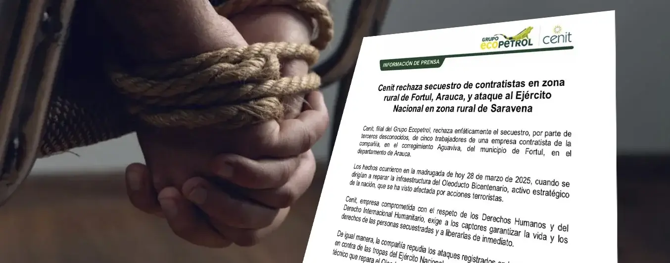 Cenit, filial del Grupo Ecopetrol, denunció el secuestro de cinco trabajadores de una empresa contratista en el corregimiento de Aguaviva, municipio de Fortul, Arauca.