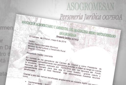 La Asociación Agropecuario y ambiental del Magdalena medio santandereano, Agromesan, envió una carta a Rubén Darío Lizarralde, ministro de Agricultura y Desarrollo Rural , en la que le expresa su total respaldo a la Federación Colombiana de Ganaderos, Fedegán, sobre lo que ha sido su administración del Fondo Nacional del Ganado, FNG.