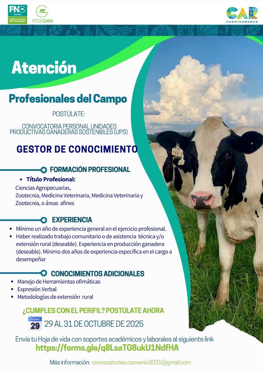 Fedegán-FNG y la CAR Cundinamarca lanzan convocatoria para profesionales con experiencia en producción ganadera, extensión rural y gestión del conocimiento que deseen vincularse al proyecto de Unidades Productivas Ganaderas Sostenibles. Las postulaciones estarán abiertas hasta el 31 de octubre de 2025.