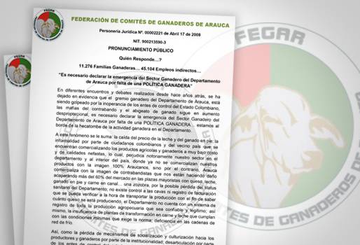 En diferentes encuentros y debates realizados desde hace años atrás, se ha dejado en evidencia que el gremio ganadero del departamento de Arauca está siendo golpeado por la inoperancia de los entes de control del Estado Colombiano. Las mafias del contrabando y el abigeato de ganado siguen en un aumento desproporcional. Por ello, la Federación de Comités de Ganaderos de Arauca a través de un comunicado de prensa solicita que se declare la emergencia del sector ganadero departamental por falta de una política ganadera. Panorama crítico De acuerdo con Jennifer García, representante legal de la entidad, la actividad ganadera de Arauca se encuentra al borde de la hecatombe. (Lea: Contrabando crece de forma desproporcionada en Arauca) “La informalidad por parte de ciudadanos colombianos y del vecino país que se encuentran comercializando productos agrícolas y ganaderos a muy bajo costo y de calidades nefastas, genera la caída del precio de la leche y del ganado en pie”, sostuvo. Agregó que lo anterior perjudica notoriamente el sector en el departamento y sus negocios con el interior del país. En ese sentido dijo que en el centro del país ya no se comercializan sus productos con la imagen 100% araucanos, sino por el contrario, con la imagen de contrabandistas que les haciendo daño y acaparando más del 60% del mercado en las plazas mayoristas con queso, leche, ganado en pie y carne en canal. Incertidumbre entre los ganaderos Por otro lado comentó que se encuentran en medio de una grana zozobra, por la posible pérdida del status sanitario del departamento pues no existe control a las cavas, ni registro de facturación que se pueda verificar a la hora de transportar la producción con el fin de saber cuánto queso se está produciendo. (Lea: Situación de inseguridad en Arauca está fuera de control) El gremio considera que Arauca no cuenta con un sistema de registro de toda la producción agropecuaria que sea confiable y legítimo. Además García habló sobre la insuficiencia de plantas de transformación en carne y leche que cumplan con las condiciones mínimas que exige la norma y las deficiencias en las cadenas de red de frío. Abandono estatal La representante del gremio también se refirió a la pérdida de mecanismos de socialización y culturización hacia los productores y ganaderos por parte de la institucionalidad y a la desarticulación por parte de los entes de control del estado colombiano, Ica, Invima, Polfa, Dian, Salud Pública, Policía y Ejercito Nacional. En cuanto al tema de la inseguridad y llamadas extorsivas, señaló que estas problemáticas están cobrando la vida de gente trabajadora, con ganas de sacar sus familias adelante. “Esta salvedad la queremos hacer visible por las constantes malversaciones que por estos tiempos estamos sufriendo”, expuso. (Lea: Sobornos y camiones repletos de carne afectan a productores de Arauca) Llamado a las autoridades Por lo expuesto anteriormente, la Federación de Comités de Ganaderos de Arauca exhorta a los entes de control para que den cumplimiento a las funciones que de por Ley les atañen, e inicien las investigaciones pertinentes en contra de los funcionarios que no den cumplimiento a sus peticiones dado que ellos son protagonistas de un abandono estatal. Asimismo reitera el llamado al Gobierno Nacional, Departamental, Municipal, y a las Instituciones Públicas, Civiles y Militares, para que acaten su sentir. “Se nos agotó la paciencia, cada día el problema va en crecimiento y el sector ganadero en detrimento, los entes de control no dan resultados y están omitiendo las funciones que de por Ley les conciernen”, aseveró. Anotó que estas entidades no toman cartas de fondo en el asunto sobre la problemática que los aqueja, que se ha venido presentado hace mucho tiempo atrás y de la cual tienen pleno conocimiento. Lea: Venezolanos estarían ingresando carne a Arauca en bolsas y maletas) En el comunicado se expone que Arauca siendo un territorio militarmente operativo con presencia institucional, civil y militar en casi todo el departamento, no se le está garantizado la seguridad, bienestar social y económico de los campesinos. Por esa razón el gremio exige que se determinen y ataquen los matices de corrupción de forma detallada, efectiva y concreta, tal y como lo indica el deber legal e institucional de los entes del Estado. Invitación a los ganaderos “¡No más pañitos de agua tibia, como los que nos están dando hasta ahora!... ¿Quién Responde…?”, cuestiona el gremio en el documento. Dadas las circunstancias, se manifiesta en el comunicado, los ganaderos se van a ver obligados a tomar las vías de hecho. Hacen un llamado a todas las bases del gremio ganadero y a todos los actores involucrados en la cadena productiva carne-leche, a participar en una serie de foros ganaderos que se van a estar realizando en los diferentes municipios, para luego hacer un foro departamental. A su vez, señalan que llegado el caso, le solicitarían a los productores a hacer parte de una movilización que vaya encaminada a defender sus derechos. (Lea: Se presume que en Arauca hay más terneros que vacas por contrabando) “La ganadería es un sector clave para la economía del departamento. El llamado es a que nos unamos para buscar el bien común y el de todas las familias araucanas”, concluye la misiva.