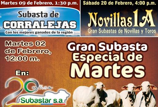 La comercializadora de Córdoba prepara una subasta especial, una de corralejas, una de novillas y toros y un evento tipo Oro como homenaje al ganado Brahman rojo y F1. El mes inicia con una subasta especial en Montería mañana martes 2 de febrero al mediodía, que fue adelantada porque el jueves 4 de febrero tendrá lugar el Día Sin Carro. También se hará un asado para motivar la asistencia de los comerciantes. El siguiente martes 9 de febrero, a la 1:30 de la tarde, se realizará la subasta especial de corralejas en el municipio de Planeta Rica, con ocasión de las fiestas del municipio. Ese día se comercializarán entre 800 y 1.000 animales, y se espera contar con la asistencia de más 100 personas. Camilo Romero, gerente general de Subastar S.A., aclaró que esta subasta se realizará el martes en lugar del miércoles para acomodarse con las actividades patronales de Planeta Rica para que los ganaderos puedan comercializar ejemplares. (Lea: Subastar aumentó venta de ganado en un 7 %) “La idea es que tampoco se cruce con los días festivos porque ellos prácticamente paralizan las actividades en esa región por motivo de sus fiestas. Son modificaciones que se hacen a la jornada de comercialización para facilitarle las cosas a los ganaderos y comerciantes”, explicó. Ese día, por cada lote de 10 animales que entren a la subasta, se dará una boleta para participar en la rifa de una silla aperada para montar San Fermín. De acuerdo con el gerente comercial, el sorteo se hace como un incentivo para que la gente continúe trabajando y participando de las subastas, sin dejar de lado el ambiente festivo que se vivirá en el municipio. Normalmente la subasta se lleva a cabo los miércoles y viernes en Planeta Rica, pero debido a que el miércoles 10 habrá una cabalgata y el viernes una tarde de toros, los organizadores de la subasta decidieron rifar una silla que el ganador podrá estrenar durante el desfile equino. (Lea: 5 estrategias para tener una subasta de ganado exitosa) El sábado 20 de febrero tendrá lugar el evento Novillas 1A en la misma ciudad. Subastar realiza este encuentro desde hace algunos años, en donde se comercializan novillas para cría de diferente calidad de diversas razas como Brahman para carne o animales cruzados tipo leche. “Al ser Planeta Rica una región de mucha producción lechera, en este evento se pueden adquirir vientres para lechería de excelente calidad de las mejores ganaderías de la región”, afirmó Romero. (Lea: Estrategias para vender ganado en subastas de Colombia) Finalmente, el siguiente sábado 27 de febrero se hará en Montería la subasta Ganado Rojo y F1, el primer evento Oro que realiza Subastar en el año. Según Romero, el evento es un homenaje que se le hace al ganado Brahman rojo comercial y puro, así como a los cruces. Debido a su carácter selectivo, tanto el evento de Novillas 1A como el del ganado Rojo y F1 contarán con la participación de alrededor de 500 animales cada uno. Sin embargo, por este mismo carácter habrá un mayor número de asistentes de regiones como Antioquia, César, Magdalena y Sucre. (Lea: Así inician las subastas ganaderas en 2016) Escuche las declaraciones de Romero
