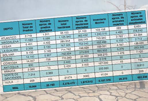 Según datos suministrados por funcionarios de todo el país del Fondo Nacional del Ganado, FNG, administrado por Fedegán, hasta el pasado 23 de junio, la cifra de animales que habían muerto producto del verano asciende a 25 mil 272 y el de los desplazados es de 601 mil 238.
