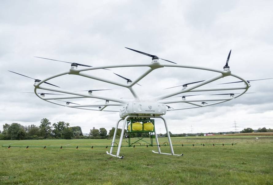 2. Volodrone: Es el resultado de una asociación entre Volocopter y el gigante de la maquinaria agrícola, John Deere. Son drones utilitarios totalmente eléctricos, capaces de cargas hasta 200 kilogramos y tener un alcance de 40 km, y cuyo propósito es la sustentabilidad en su diseño.