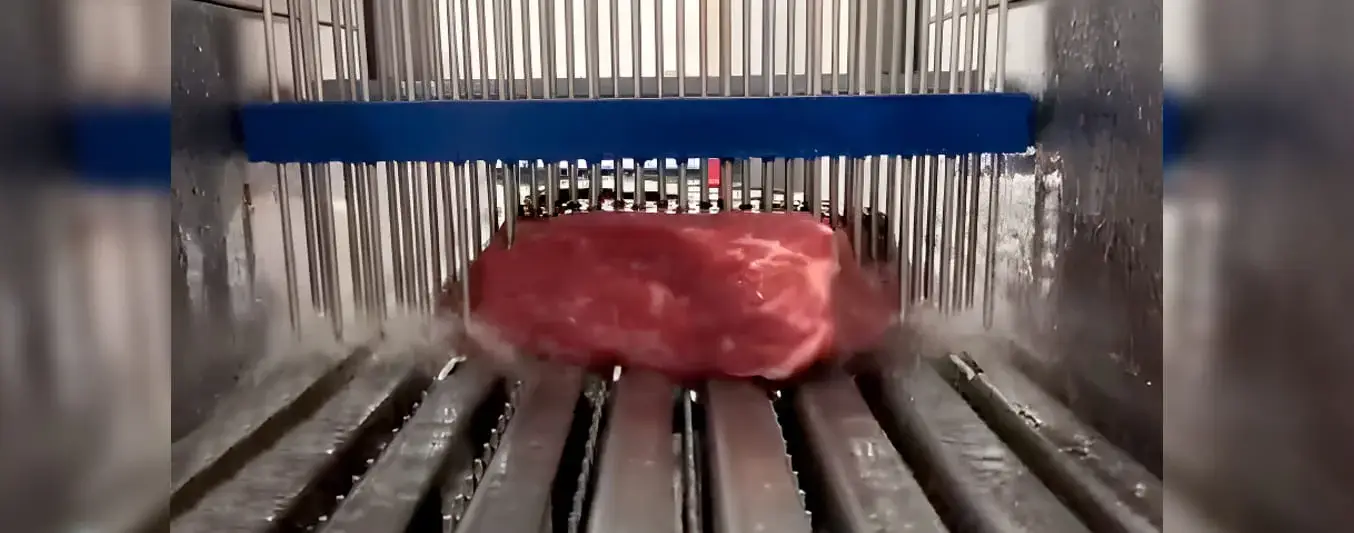 Un trozo de carne pasa por la cinta transportadora y unas agujas suben y bajan clavándose en la pieza.