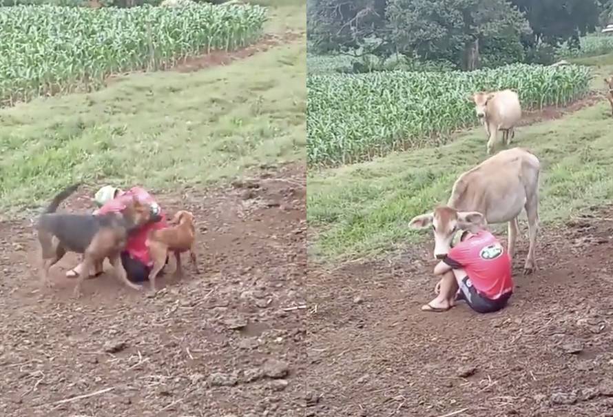 El vídeo muestra al hombre acuclillado en el pasto, aparentemente desanimado y con los hombros caídos. Sus perros, dos fieles compañeros de raza criolla, rápidamente notan la tristeza de su dueño y acuden a su lado. Observando atentamente al hombre, los perros parecen entender que algo no está bien y deciden tomar acción. Se acercan al ganado de su amo.