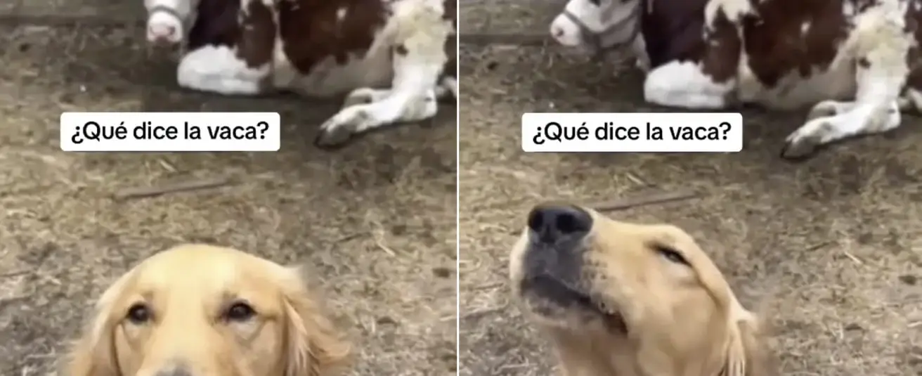 La mujer, visiblemente divertida, le pregunta al can: "¿Cómo hace la vaca?”, la respuesta no es un ladrido común; en cambio, el aparentemente labrador sorprende a todos emitiendo sonidos similares a los mugidos de una vaca.